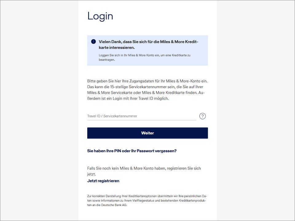 Sollten Sie Ihre Travel ID für den Login nutzen wollen, muss diese vorab mit Ihrem Miles & More Konto verknüpft sein.