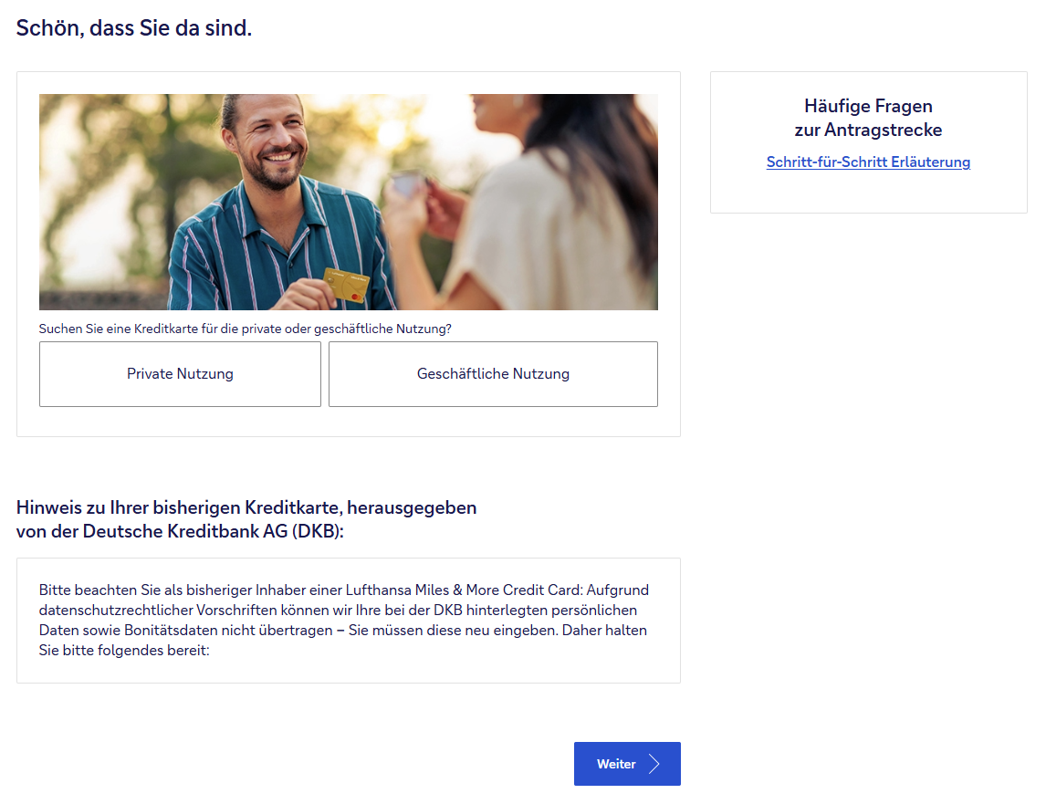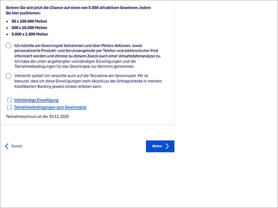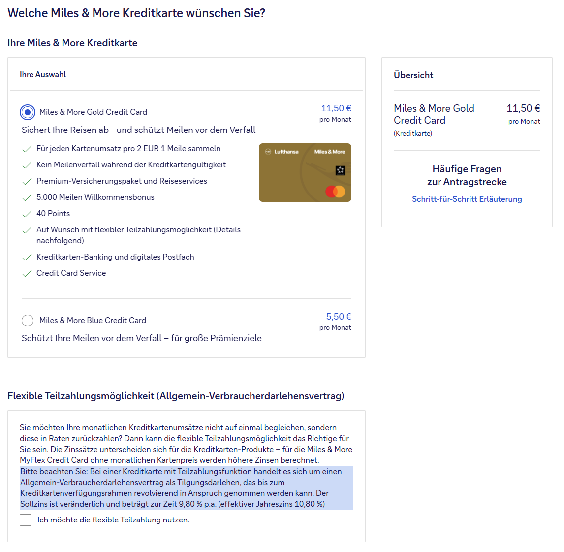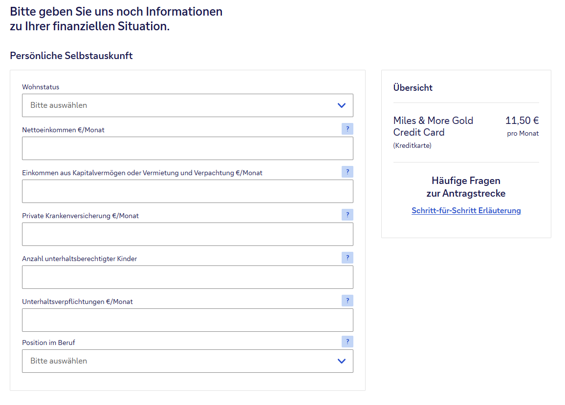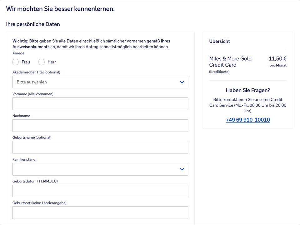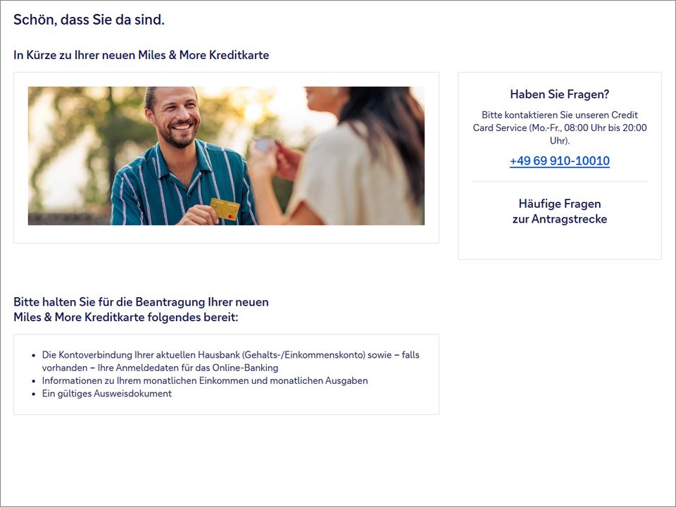 Um Ihre Miles & More Kreditkarte zu beantragen, ist die Teilnahme am Miles & More Programm erforderlich.