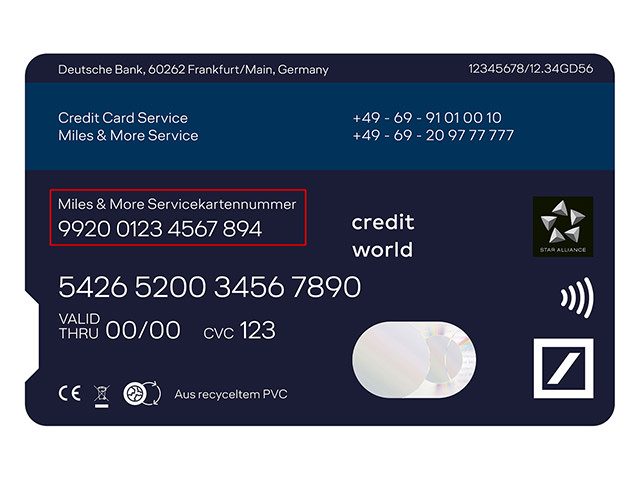 Diese Nummer entspricht in Aufbau, Länge und Funktion der Nummer auf der Miles & More Servicekarte (ohne Kreditkartenfunktion). Die Miles & More Servicekartennummer auf der Kreditkarte ist jedoch nicht identisch mit der Nummer auf Ihrer Miles & More Servicekarte (sofern vorhanden).