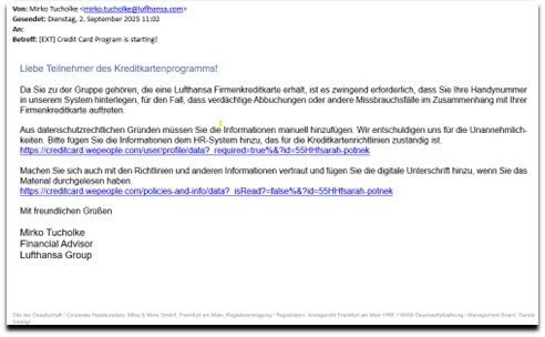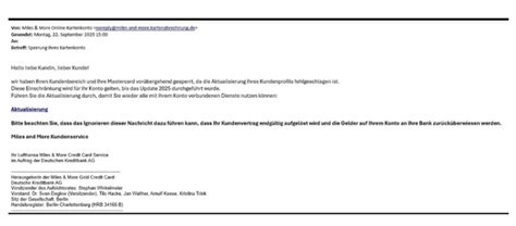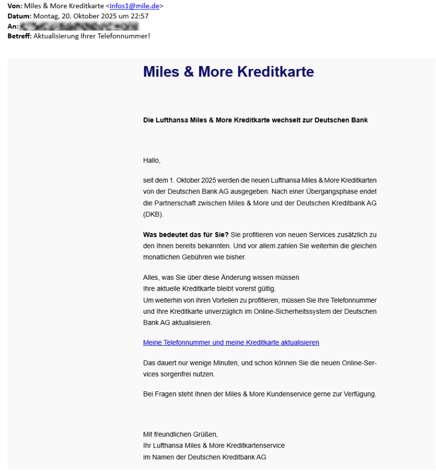 Zwar hat die Deutsche Bank seit dem 1. Oktober 2025 tatsächlich die Herausgabe der Miles & More Kreditkarten übernommen – die vorliegende E-Mail stammt jedoch nicht von der Deutschen Bank, der DKB oder Miles & More.